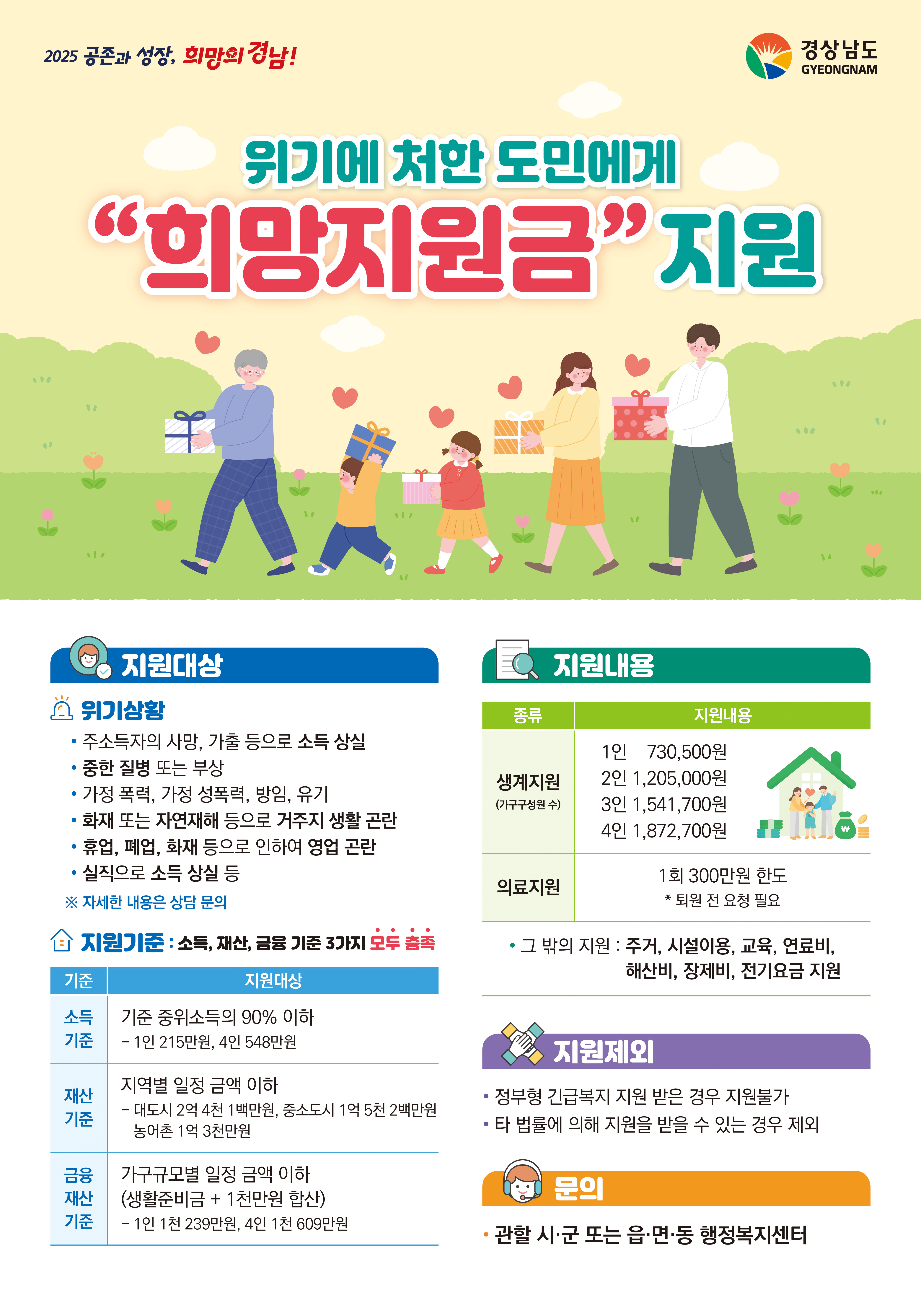 경상남도는 2025년부터 기존 법·제도적 지원을 받지 못하는 저소득 위기가구를 위해 '희망지원금' 제도를 도입하였습니다.이 지원금은 가정 내 주 소득자의 실직, 폐업, 사망, 질병 등으로 인해 위기에 처한 가구를 대상으로 생계비, 의료비, 주거비, 교육비 등을 지원합니다.