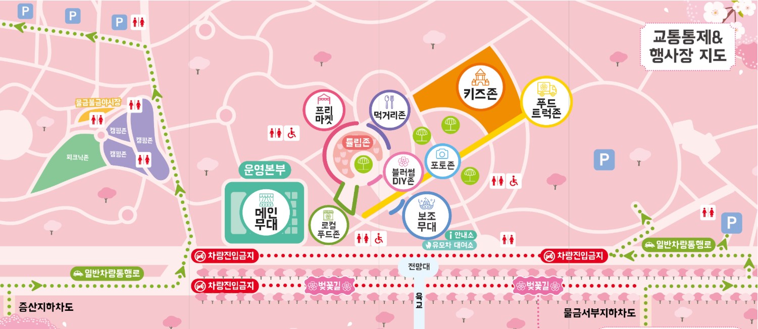 축제 기간 동안 물금서부지하차도부터 황산캠핑장 입구까지 약 900m 구간의 벚꽃길은 보행자 전용으로 운영되며, 차량 출입이 통제됩니다.