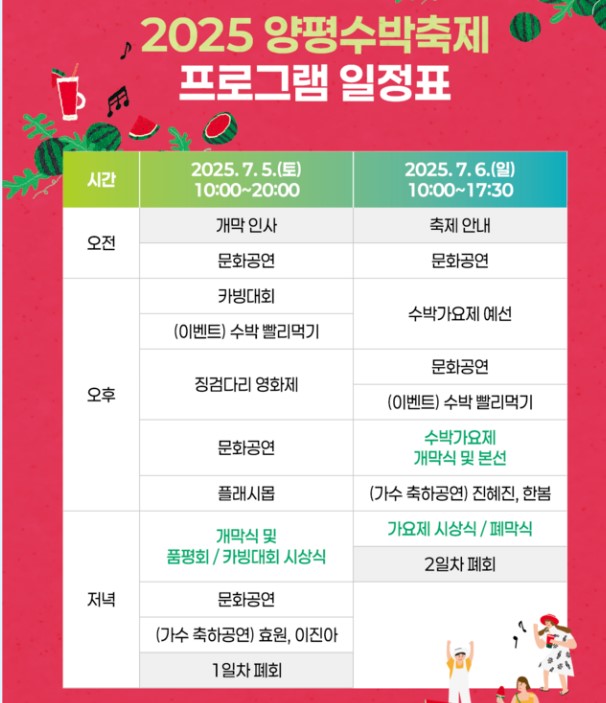 - 수박 시식 코너 & 직거래 부스: 신선한 양평 수박을 현장에서 맛보고 구매할 수 있습니다.