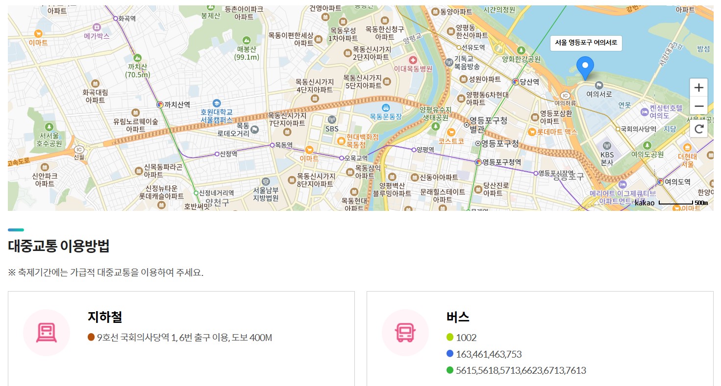 교통 통제 안내: 축제 기간 동안 원활한 진행을 위해 4월 2일 낮 12시부터 4월 9일 오후 2시까지 국회 뒤편 여의서로(1.7km)와 서강대교 남단 공영주차장~여의 하류 IC 구간의 교통이 전면 통제됩니다. 방문객께서는 가급적 대중교통을 이용해 주시기 바랍니다.